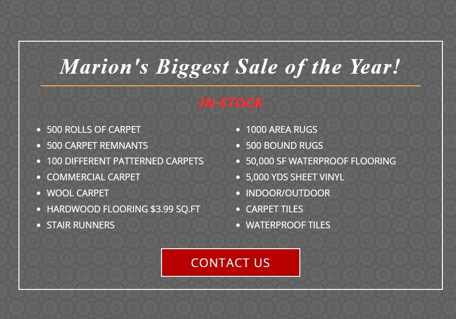 Marion's Carpet & Flooring Warehouses offers a range of services including flooring sales (carpet, hardwood, luxury vinyl, laminate, and area rugs), subcontracted professional installation. We also provide custom carpet binding services to turn purchased carpet remnants into items like rugs, stair runners, and mats.Our Biggest Sale of the Year